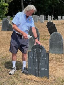 In 1847 the mother and child had immigrated from Scotland to join their husband/father, living in North Andover, and working in one of the wool carding mills. The infant died on the day they arrived; the mother died 2 weeks later.Drew originally contacted the North Andover Historical Society. Inga Larson (now Laakso), archivist at that time, found Town records indicating that the burial did take place in the Second Burying Grounds, which in 1847, were under the care of the North Parish.Family lore tells that the father/husband did not have enough money to pay for a headstone so, like many others, they were buried in an unmarked grave. The husband later moved to Wisconsin for a better job, remarried, and pledged that, when he was financially able, he and his new wife would return to have a headstone installed.Time passed – through initial contacts with North Parish, the husband/father learned that the sexton (who handled burials) had died, and no one knew the exact location where the mother and child had been buried. Sometime later he and his wife both died – the issue remained incomplete until Drew’s investigation into family genealogy uncovered the story.In March of 2018 Drew contacted our office administrator, Stephanie, who forwarded his letter to Debb Putnam, liaison to the Cemetery team. She discussed it with team member Kathy Stevens, Rev. Lee, and the Board Chair. We were all in agreement and gave Drew the OK. Minxie and Jim Fannin (who were doing headstone restoration work for us) passed along two referrals for carvers who could do a historically appropriate marker. In gratitude, Drew donated to the North Parish Cemetery Fund.Time passed, again – Drew worked with his chosen carver, Karin Sprague of Rhode Island, on the headstone proposal, review, and creation; COVID restrictions on gatherings and travel postponed plans for a family gathering; North Parish passed the cemetery ownership to Ridgewood (with a confirmation that they would honor this installation).Finally, this summer, Drew contacted Debb and the Ridgewood staff to say they were ready to install. After assuming ownership of the cemetery, Ridgewood had done work with ground penetrating radar that enabled them to suggest a site for the headstone placement.These photos from the day – Karin, in the blue T-shirt, designed and carved the stone. In the last photo Drew is blessing the stone with some special water Karin brought, while she read a beautiful dedication she had written. A wish fulfilled.
