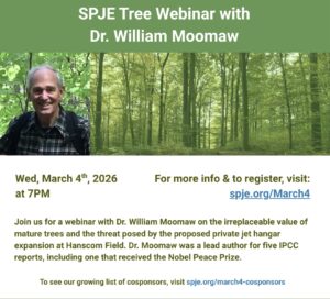 Trees stand ready and tall in our fight against the climate crisis. And yet they are threatened by constant human expansion. Plan on joining a scheduled webinar on March 4 at 7 pm to hear the fascinating and eminent Dr. William Moomaw speak on how trees are critical to biodiversity and carbon sequestration. Dr. Moomaw’s talk will particularly focus on the importance of trees as they relate to the implications for the proposed private jet expansion at Hanscom Airforce Base where 20 acres of trees are threatened. More details to come, including the meeting link. Save the date and time on your calendar now! About the author: Dr. Moomaw has been a lead author of five major Intergovernmental Panel on Climate Change (IPCC) reports. As a Science Fellow, he worked in the U.S. Senate on energy and forestry legislation and on legislation that eliminated American use of CFCs in spray cans to protect the ozone layer. He was the first director of the climate program at the World Resources Institute in 1988 He has been elected an American Association for the Advancement of Science Fellow. Dr. Moomaw was also founding director of the Tufts Institute of the Environment, Tufts Climate Initiative, and co-founder of the Global Development and Environment Institute. (from https://scienceimpact.mit.edu/people/bill-moomaw )