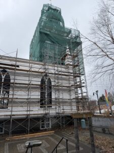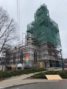 Scaffolding is now fully in place around the Meetinghouse, including the steeple, as work on the Green Envelope Project moves forward.